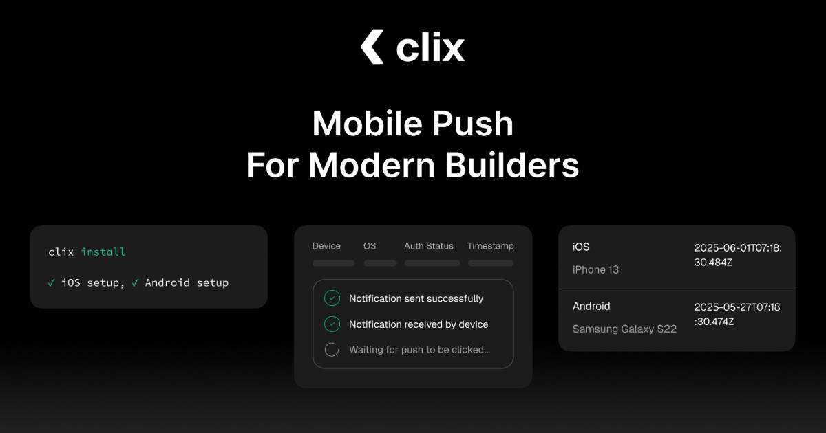 Clix gives developers a simple CLI, SDKs, and API to send and automate mobile push notifications. One "clix install" and you are live. Go build automated campaigns with time or behavior-based triggers to keep users engaged.
